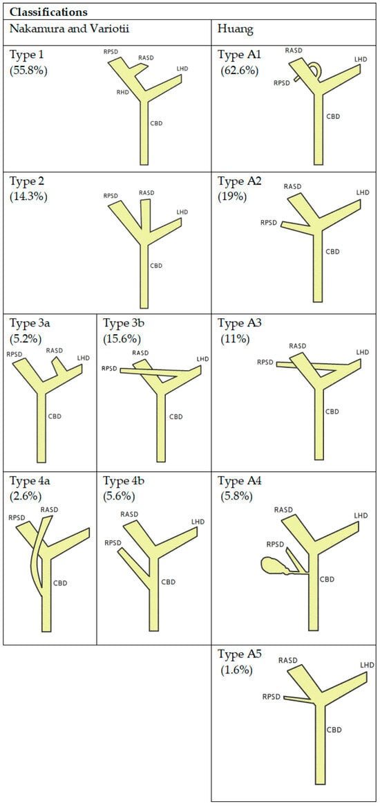 Schematic diagrams of the anatomical variants of the bile ducts according to Nakumra, Variotti, Huang and respective frequencies (in parenthesis). RPSD—right posterior sectoral duct, RASD—right anterior secoral duct, RHD-right hepatic duct, LHD—left hepatic duct, CBD—common biliary duct.