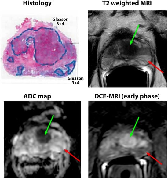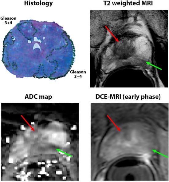 A 53-year-old patient with PSA of 5.1 ng/mL with a Gleason 3 + 4 lesion (green arrow) in the left peripheral zone that was identified on mpMRI. The lesion was focally hypointense on T2W (T2 = 94 ± 34 ms) and ADC (1.13 ± 0.26 μm2/ms) but showed no focal enhancement on early-phase DCE-MRI. However, another Gleason 3 + 4 lesion in the right transition zone (red arrows) was unidentified on MRI (no focal area of abnormal MR signal that correlates with cancer presence). The lesion was isointense on T2W (T2 = 138 ± 52 ms) and ADC (1.45 ± 0.41 μm2/ms) and showed no focal enhancement on early-phase DCE-MRI, making it indistinguishable from the surrounding benign tissue. Even though it was found to have high glandular density, it was adjacent to very dense benign glands.