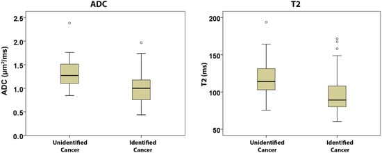 Unidentified cancers had significantly higher ADC (1.34 ± 0.38 vs. 1.02 ± 0.30 μm2/ms, p < 0.001) and T2 (117.0 ± 31.1 vs. 97.1 ± 25.1 ms, p = 0.005) compared with cancers identified on MRI.