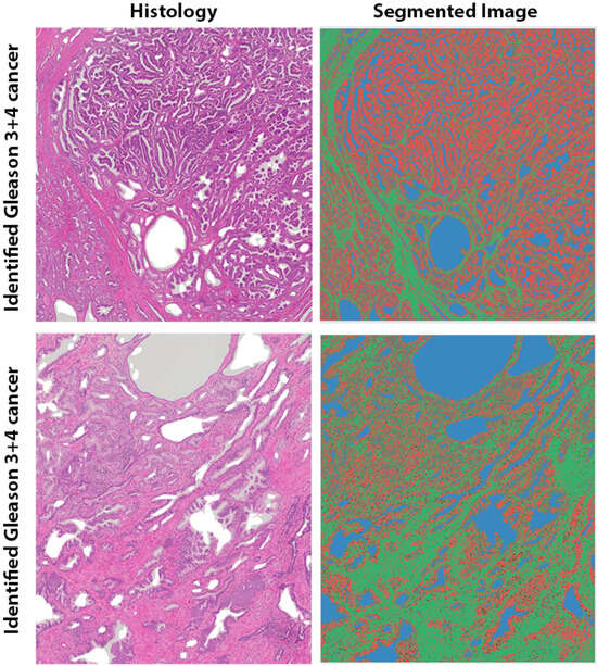 The identified Gleason 3 + 4 cancer from the posterior peripheral zone from the apex midline (top) had higher glandular density compared with the MR-unidentified Gleason 3 + 4 cancer from the right peripheral zone (bottom) from the same patient (76 years old). Tissue components were segmented into stroma (green), epithelium (red), and lumen (blue). The tissue composition in the identified cancer and the unidentified cancer was different: stroma, 21.5 vs. 45.7%; epithelium, 60.6 vs. 34.0%; and lumen, 17.9 vs. 20.4%. In addition, the identified cancer (40%) had a greater proportion of Gleason pattern 4 than the unidentified cancer (10%).
