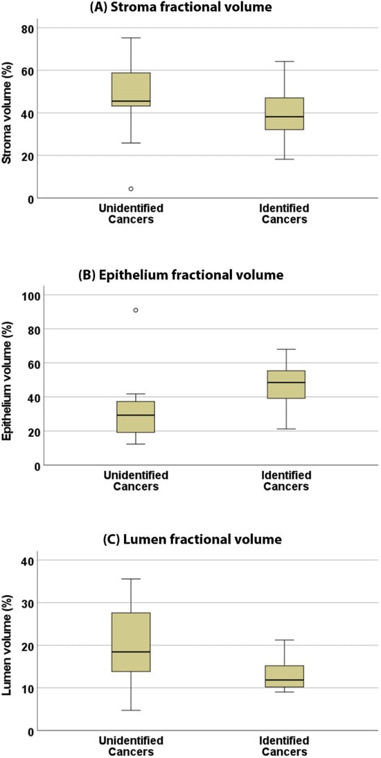 An investigation into the tissue composition of these cancers as presented in these box-plots showed that unidentified cancers had significantly lower epithelium volume (B), 32.9 ± 21.5 vs. 47.6 ± 13.1% (p = 0.034), and significantly higher lumen volume (C), 20.4 ± 10.0 vs. 13.3 ± 4.1% (p = 0.021), compared with identified cancers. However, no difference in stroma volume (A) was found between the unidentified and identified cancers (46.6 ± 19.9 vs. 39.1 ± 13.3%, p = 0.154).