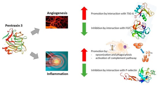 Pentraxin 3 (PTX3) is a multi-functional parameter with multifaceted regulatory functions in inflammatory processes involved in the organization of ECM (extracellular matrix) and remodeling [46]. A rise in blood PTX3 levels acts as a marker for the onset of inflammation. The fact that the maximum PTX3 level elevates slightly earlier than the CRP level reveals that PTX3 is a sensitive inflammation-related marker [37]. Furthermore, it has been shown that PTX3 may play a role as an extrinsic tumor-suppressor gene by controlling complement-dependent and macrophage-associated tumor-promoting inflammation [47]. Its expression has been found, among others, in lung cancer, glioma, ovarian cancer, myxoid liposarcoma, prostate carcinoma, esophageal squamous cell carcinoma, and pancreatic cancer [48]. Interestingly, PTX3 has been also shown as a biomarker (prognostic indicator of short-term mortality) of clinical PASC (post-acute sequelae of SARS-CoV-2), also known as post-COVID syndrome [49,50]. Some other authors revealed the involvement of PTX3 in the tumor microenvironment in promoting cancer metastasis, invasion, and stemness. Those findings not only described the biological significance of PTX3 in tumorigenesis, but also suggested that PTX3 may be a key pro-tumorigenic player in the tumor microenvironment [51]. It has also been proven that PTX3 can act as an FGF2 antagonist, as it has the possibility to bind to FGF2 with high affinity and specificity. This interaction prevents the binding of FGF2 to its cognate tyrosine kinase receptors, leading to the inhibition of the angiogenic activity of the growth factor [52].