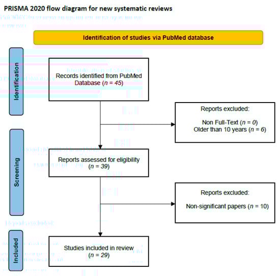 We performed a comprehensive literature search using the MEDLINE/PubMed electronic database on 21 October 2023. Table 2 and Figure 2 were added to explain the search strategy for this systematic review. This review was not registered in PROSPERO at inception. For the first data search, we found 45 papers. We also applied two additional filters: Full-Text in Text Availability and 10 years for Publication Date. In the case of the use of these data search exclusions, we found 39 papers. In the next step, we excluded all papers that were non-significant (papers not concerning PTX3, GI cancers, duplicated, or retracted). Finally, 29 publications were included in the study. All steps were included in the PRISMA 2020 Flow Diagram (Figure 2) [93].