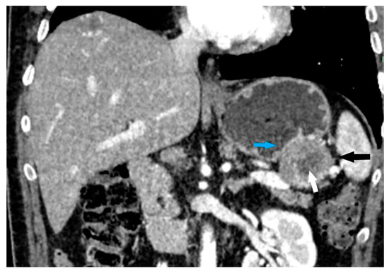Figure 3. CT scan coronal view clearly depicts oval, clearly demarcated lesion (black arrow) covered by intact mucosa (blue arrow) with partially necrotic structure (white arrow) and weak postcontrast opacification of solid part of the lesion.