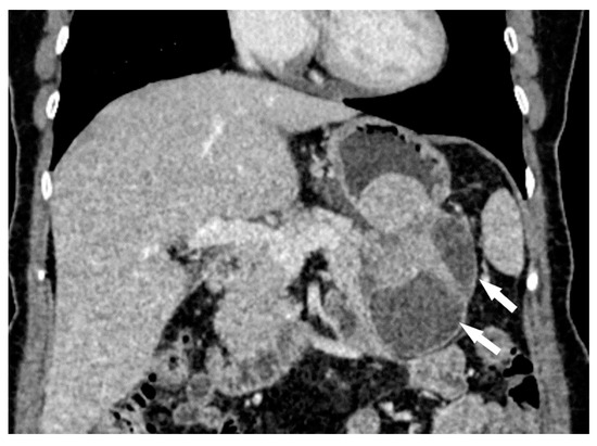 Figure 4. Abdominal CT exam coronal view shows irregular tumor shape with presence of cystic structural changes (white arrow). The tumor corresponds to HR GIST.- Tumor shape: regular or irregular (Figure 1);