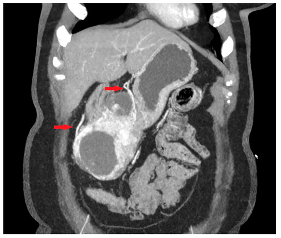 Figure 6. CT coronal view shows irregular, partially cystic tumor with hyperdense solid component and presence of peri- and intra-tumoral vascular vessels (red arrows) (EFDV).- The presence of visible enlarged vascular structures draining/feeding the tumor (EFDV “enlarged feeding or draining vessel”) (Figure 6);