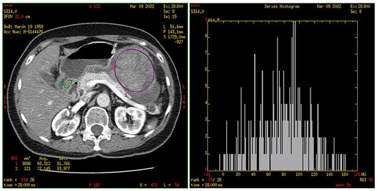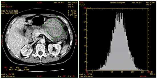 Texture analysis was performed with the software MaZda (Version 4.6 for Windows, Institute of Electronics, Technical University of Lodz, Poland). The solid part of the tumor was segmented into three consecutive sections in the portal venous phase. A healthy structure was also marked; in our case, it was a normal gastric wall. The values of the first-order texture, i.e., histogram parameters, were automatically obtained and were as follows: the normalized frequency of pixels of the lowest intensity (“min norm”) and the highest intensity (“max norm”), mean intensity (“mean intensity”) and standard deviation (“variance”), as well as “skewness “, i.e., asymmetry, and “kurtosis”, i.e., the peak/flatness of the histogram. The mentioned values were obtained for each of the three sections, while their mean values for the GISTs and stomach wall were used for further statistical data processing (Figure 8 and Figure 9).
