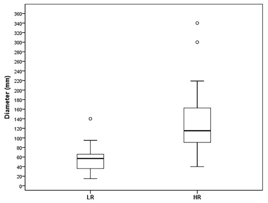 The smallest tumor diameter in the LR group was 15 mm and the largest was 150 mm (mean 56 ± 25 mm), while the range in the HR group was from 40 mm to 340 mm (mean 131 ± 58 mm), p < 0.001 (Figure 10).