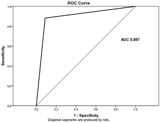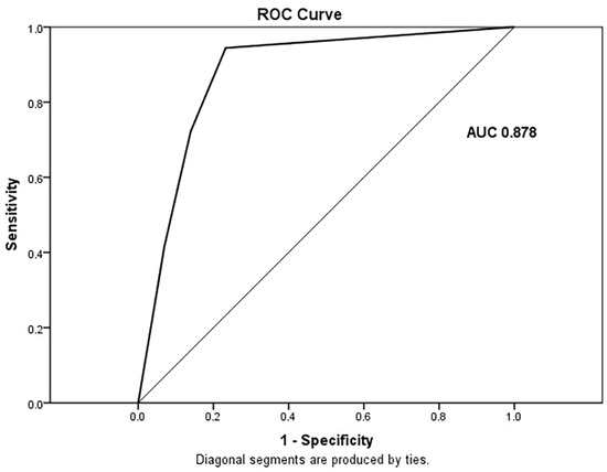 ROC curve of multivariate regression model with two independent predictors for HR GISTs (P (0–1)) = 0.346 × mucosa (1—continuous/2—interrupted) + 0.493 × EFDV (1—present/0—absent)–0.222). AUC = 0.878 (CI: 0.797–0.959), sensitivity 94%, specificity 77% and accuracy 88%.