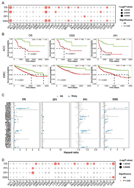 The clinical prognostic significance of CILP2 in pan-cancer. (A) A summary of the correlation between CILP2 expression and overall survival (OS), disease-specific survival (DSS), disease-free interval (DFI), and progression-free interval (PFI) in pan-cancer. (B) High expression levels of CILP2 were significantly correlated with shorter OS, DSS, and DFI in adenoid cystic carcinoma (ACC) and kidney renal clear cell carcinoma (KIRC). (C) The prognosis value of the expression level of CILP2 in pan-cancer through a single variate Cox regression analysis. (D) The prognosis value of CILP2 low vs. high methylation levels in pan-cancer. NS, no significance; *, p < 0.05; **, p < 0.01; ***, p < 0.001.