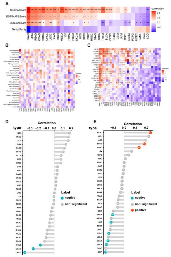 Immune cell infiltration analyses of CILP2 across the different cancers. (A) The correlations between CILP2 and the tumor purity, stromal, immune, and ESTIMATE scores in pan-cancer. (B) The correlation between CILP2 and immune cell infiltration in pan-cancer. (C) Correlation between CILP2 and immune suppressor genes in pan-cancer. (D) Correlation between CILP2 and MSI. (E) Correlation between CILP2 and TMB. *, p < 0.05; **, p < 0.01; ***, p < 0.001, ****, p < 0.0001.