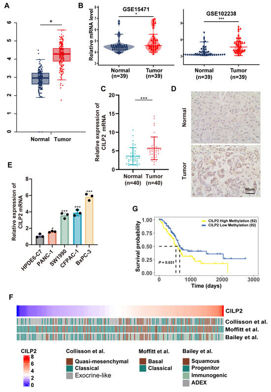 Based on the previous univariate COX prognostic analysis, TME analysis, and immune infiltration analysis conducted within the pan-cancer scope, all of which demonstrated the value of CILP2 in PAAD, we further explored the expression profile of CILP2 in PDAC (the most common and typical type of pancreatic cancer). Both the TCGA-PDAC cohort (Figure 4A) and multiple GSE datasets (Figure 4B) revealed high expression levels of CILP2 in pancreatic cancer tissues compared to normal adjacent tissues. The results of the qRT-PCR analysis showed the significant upregulation of CILP2 in pancreatic cancer tissues compared to their corresponding adjacent non-tumor tissues (Figure 4C). These findings were consistent with the results obtained from the IHC analysis of the 40 paired human pancreatic cancer samples (Figure 4D). Additionally, the CILP2 mRNA levels were significantly increased in four pancreatic cancer cell lines (Figure 4E), including PANC-1, BxPC-3, SW1990, and CFPAC-1, when compared to the HPDE6-C7 line. The baseline table of clinical features also revealed differences in the CILP2 mRNA expression levels among the different subtypes of PDAC (Table 1), though other clinical pathological features did not show any differences (Table S4). Specifically, patients with high expression levels of CILP2 were more likely to exhibit quasi-mesenchymal/basal/squamous subtypes (Figure 4F), which are typically associated with malignant biological behaviors and poorer prognoses [26]. This finding might also explain the negative correlation between CILP2 and patient prognosis, as was observed in the survival analysis. Furthermore, a high level of methylation in CILP2 was correlated with shorter overall survival in PDAC (Figure 4G).