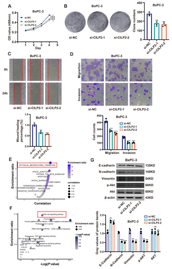 CILP2 promoted the proliferation, migration, and invasion of the PDAC cell lines. (A,B) show the effects of CILP2 knockdown on the proliferation of the BxPC-3 cells as measured by the CCK-8 assay and colony formation assay, respectively. (C,D) show the effects of CILP2 knockdown on the migration and invasion of the BxPC-3 cells as measured by the transwell and wound healing assays. (E) The gene set variation analysis of CILP2 in pancreatic cancer. (F) The KEGG enrichment analysis of CILP2 in pancreatic cancer. (G) The effects of the CILP2 knockdown on EMT and the PI3K-AKT pathway in BxPC-3 cells as measured by Western blot. Original western blots are presented in File S1. p < 0.05; **, p < 0.01; ***, p < 0.001.