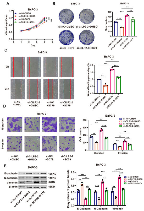 CILP2 promoted the proliferation, migration, and invasion of the PDAC cell lines via the PI3K-AKT pathway. (A,B) show the CCK-8 and colony formation assays, respectively, used to examine cell proliferation in the BxPC-3 cells. The cells were transfected with si-CILP2 and treated with SC79 or a corresponding negative control. (C,D) show the transwell and wound healing assays, respectively, used to examine the cell migration and invasion of the BxPC-3 cells. The cells were transfected with si-CILP2 and SC79 or a corresponding negative control. (E) The Western blot assay used to examine the expression of EMT in the BxPC-3 cells. The cells were transfected with si-CILP2 and treated with SC79 or a corresponding negative control. Original western blots are presented in File S1. **, p < 0.01; ***, p < 0.001.