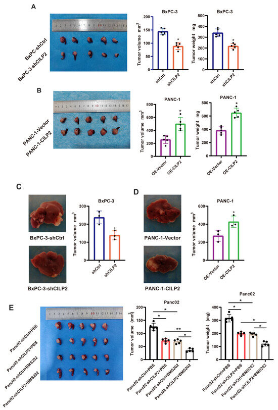 The knockdown of CILP2 inhibited the progression of pancreatic cancer in vivo. (A) The tumor volumes and weights of the orthotopic tumors in the BxPC-3-shCtrl and BxPC-3-shCILP2 groups. (B) The tumor volumes and weights of the orthotopic tumors in the PANC-1-Vector and PANC-1-CILP2 groups. (C) The tumor volumes of the liver metastatic tumors in the BxPC-3-shCtrl and BxPC-3-shCILP2 groups. (D) The tumor volumes of the liver metastatic tumors in the PANC-1-Vector and PANC-1-CILP2 groups. (E) The tumor volumes and weights of the Panc02-shCILP2 orthotopic tumors in the mice treated with the vehicle control (Ctrl) or BMS202 (20 mg/kg). *, p < 0.05; **, p < 0.01.