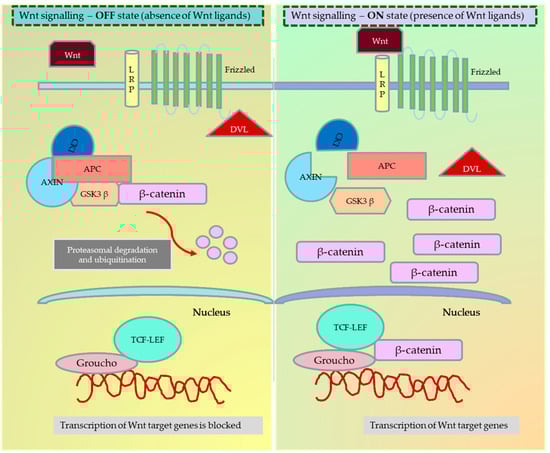 Wnt signalling—Canonical pathway in the ON and OFF state. When the frizzled family of receptors binds to the Wnt ligand, it recruits the dishevelled (Dsh) protein in the cell to frizzled receptors. Based on the dependency on β-catenin, the Wnt ligands are known to activate three different pathways—the canonical (β-catenin dependent) pathway, the noncanonical (β-catenin independent) pathway, and the noncanonical planar cell polarity pathway. In the ON state, the recruitment of Dsh to the cell membrane causes the disintegration of the APC degradation complex and the release of β-catenin. The free β-catenin can now translocate to the nucleus and bind to the T-cell factor/lymphoid enhancer-binding factor (TCF/LEF) family to activate the transcription of target genes. In the OFF state, the destruction complex phosphorylates and ubiquitinizes the β-catenin, preventing the translocation and activation of β-catenin target genes inside the nucleus. The figure was made in Microsoft Office PowerPoint.