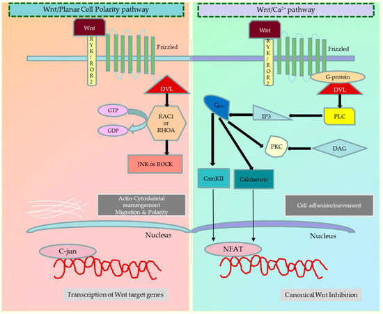 The dysregulation of Wnt signalling in cancer impacts crucial tumour properties such as proliferation, invasion, migration, epithelial–mesenchymal transition, metastasis, apoptosis, senescence, therapy resistance, immune evasion, and relapse. Altered Wnt signalling has been observed in various cancer types, such as colon, breast, leukaemia, and melanoma. This pathway is influenced by a myriad of intracellular and extracellular components, endogenous and exogenous inhibitors, and cross-talk with other pathways, further contributing to cancer progression [4,5]. Figure 1 and Figure 2 illustrate the canonical and noncanonical Wnt signalling pathways.