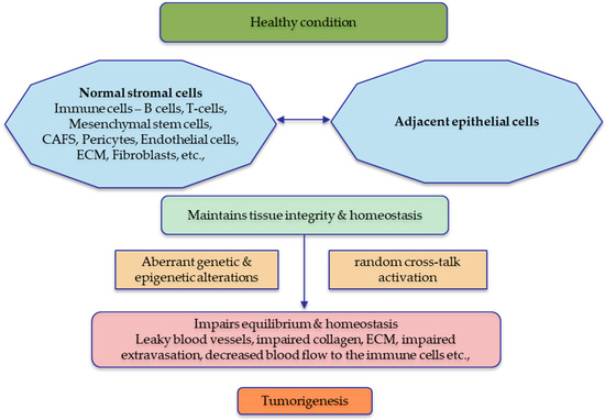 Tumour microenvironment in a healthy state vs. diseased state. The normal stromal cells are essential for maintaining the integrity of the neighbouring epithelial cells, and sustained cross-talk is observed for tissue homeostasis. Any aberrations in the normal stroma or the adjacent epithelial cells will significantly affect the stability of the tissues, which leads to tumorigenesis. The figure was made in Microsoft Office PowerPoint.