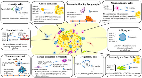 Interestingly, CAFs also regulate the secretion of Wnt proteins that induce tumour progression. CAFs in colorectal, endometrial, and oesophageal cancers contribute to the secretion of Wnt5a, Wnt1, Wnt10b, and Wnt2, further promoting tumour proliferation, migration and relapse by activating canonical/noncanonical Wnt pathways [71,72,73,74].