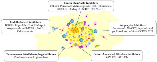 Modifications are brought about within the TME by various inhibitors targeting Wnt signalling, which can impede the tumour’s growth, invasion, and metastasis. These inhibitors have resulted in alterations of the different components of the TME, including cancer stem cells, endothelial cells, adipocytes, tumour-associated macrophages, and cancer-associated fibroblasts. The figure was made in Microsoft Office PowerPoint.