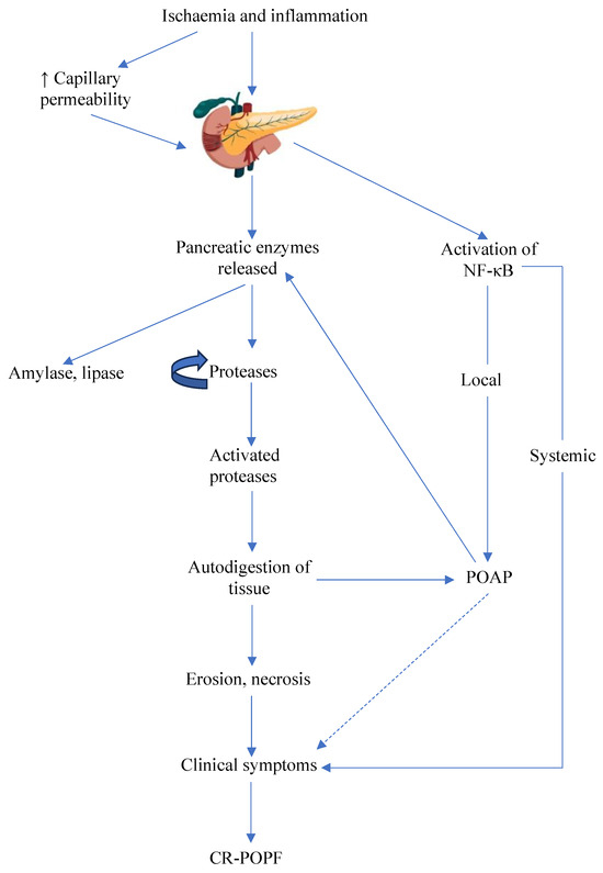 CR-POPF begins with ischaemia, which causes an active pancreas to secrete protease-rich fluid as early as the time of surgery (Figure 1) [8,9]. These proteases, mainly trypsin and chymotrypsin, are activated either locally, by pepsin in gastric secretions, enterokinases in the duodenum, or in acidic environments created by bacteria and fungi [10,11]. Trypsin then continues the activation of proteases, which digest neighbouring tissues, causing erosion, necrosis, and the leakage of pancreatic juice into the abdomen [11], exacerbating the fistula and associated pancreatitis. Local ischaemia also increases capillary permeability, worsening pancreatic juice leakage into neighbouring tissues [12]. This process continues during the initial inflammatory phase of anastomotic healing and wound closure [13]. The enzymatic pathogenesis is accompanied by an independent inflammatory cascade mediated by acinar cells [14]. In CR-POPF patients, this was confirmed by the identification of the inflammatory marker NF-κB at the surgical transection line [15], which is widely implicated in acute pancreatitis [16]. Activation of NF-κB in acinar cells mounts both a local and systemic inflammatory response, independently of trypsinogen [17,18]. Together, these contribute to a symptomatic pancreatic leak, which is ultimately diagnosed as CR-POPF.