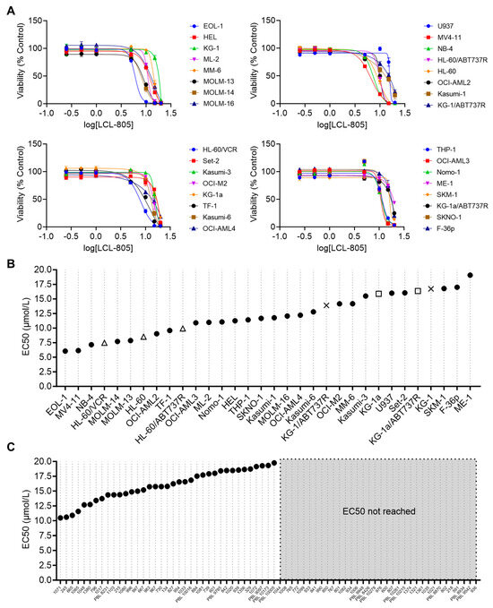LCL-805 reduced viability of human AML cell lines and primary patient samples. (A) Cell viability of 32 human AML cell lines treated with vehicle (DMSO) or the indicated concentrations of LCL-805 for 48 h. (B,C) Calculated LCL-805 EC50 values across AML cell lines (B) or primary AML patient samples (C). Legend for parental and drug-resistant cell line pairs: HL-60 (△); KG-1 (×); KG-1a (□); ABT737R = ABT737-resistant; VCR = vincristine-resistant. Data represent the average of three technical replicates from a representative experiment. Error bars represent +/− standard deviation.
