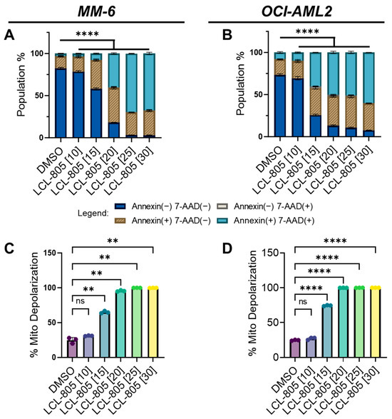 LCL-805 increased phosphatidylserine externalization and triggered mitochondrial depolarization. (A,B) Annexin V and 7-AAD flow cytometry in MM-6 and OCI-AML2 treated for 24 h with vehicle (DMSO) or the indicated concentrations of LCL-805 (in µM, shown in brackets). (C,D) Mitochondrial membrane potential in MM-6 and OCI-AML2 treated for 24 h with DMSO or the indicated concentrations of LCL-805. Bars represent the average of three technical replicates from a representative experiment. Error bars represent +/− standard deviation. Statistical analyses represent two-way ANOVA with Dunnett’s multiple comparisons test (A,B) and Welch’s ANOVA with Dunnett’s multiple comparisons test (C,D). ** p < 0.005, **** p < 0.0001, ns = non-significant.