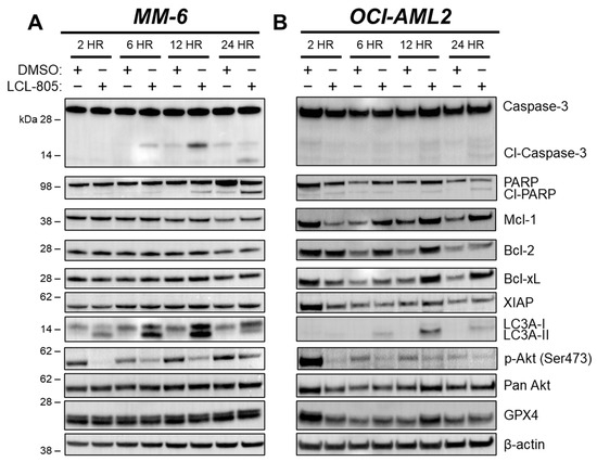 LCL-805 induced caspase-3 and PARP cleavage, LC3A processing, and reduced Akt phosphorylation. Immunoblotting of MM-6 (A) and OCI-AML2 cells (B) treated with DMSO or LCL-805 (15 µM) for the indicated times. Data are from a representative experiment. Whole, unedited western blot figures can be found in the supplementary materials.