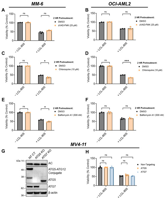 Inhibition of caspases or autophagy did not rescue LCL-805-mediated cell death. (A,B) Cell viability of MM-6 and OCI-AML2 cells pretreated with vehicle (DMSO) or zVAD-FMK (25 µM) for 2 h and subsequently treated with DMSO or LCL-805 (15 µM) for 24 h. (C,D) Cell viability of MM-6 and OCI-AML2 cells pretreated with vehicle (DMSO) or chloroquine (10 µM) for 2 h and subsequently treated with DMSO or LCL-805 (C = 20 µM; D = 17.5 µM) for 24 h. (E,F) Cell viability of MM-6 and OCI-AML2 cells pretreated with vehicle (DMSO) or bafilomycin A1 (500 nM) for 2 h and subsequently treated with DMSO or LCL-805 (E = 20 µM; F = 17.5 µM) for 24 h. (G) Immunoblotting of AC (α-subunit), ATG5, and ATG7 protein levels in non-targeting control (NT CT), ATG5-deficient (ATG5 KO), or ATG7-deficient (ATG7 KO) MV4-11 cells. (H) Cell viability of NT CT, ATG5 KO, or ATG7 KO MV4-11 cells treated with vehicle (DMSO) or LCL-805 (10 µM) for 24 h. Bars represent the average of three technical replicates from a representative experiment. Error bars represent +/− standard deviation. Statistical analyses represent unpaired Welch’s t-tests with Holm–Šídák’s multiple comparisons test (A–F) and two-way ANOVA with Dunnett’s multiple comparisons test (H). * p < 0.05, *** p < 0.001, ns = non-significant. Whole, unedited western blot figures can be found in the supplementary materials.