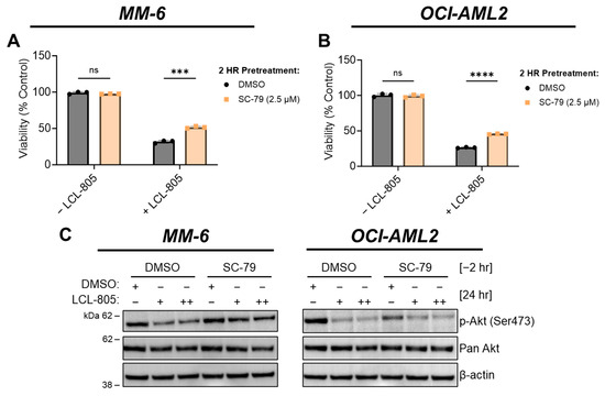 Akt reactivation rescued LCL-805-induced cell death. (A,B) Cell viability of MM-6 and OCI-AML2 cells pretreated with vehicle (DMSO) or SC-79 (2.5 µM) for 2 h and subsequently treated with DMSO or LCL-805 (A = 20 µM; B = 17.5 µM) for 24 h. (C) Immunoblotting of MM-6 and OCI-AML2 cells pretreated with SC-79 (2.5 µM) for 2 h then treated with DMSO or LCL-805 (MM-6: + = 17.5 µM, ++ = 20 µM; OCI-AML2: + = 12.5 µM, ++ = 15 µM) for 24 h. Bars represent the average of three technical replicates from a representative experiment. Error bars represent +/− standard deviation. Statistical analyses represent unpaired Welch’s t-tests and Holm–Šídák’s multiple comparisons test. *** p < 0.001, **** p < 0.0001, ns = non-significant. Whole, unedited western blot figures can be found in the supplementary materials.