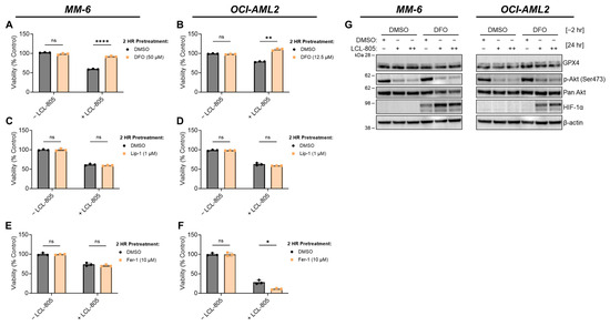 Iron chelation rescued LCL-805-induced cell death. (A,B) Cell viability of MM-6 and OCI-AML2 cells pretreated with vehicle (DMSO) or the indicated concentration of DFO for 2 h and subsequently treated with DMSO or LCL-805 (15 µM) for 24 h. (C,D) Cell viability of MM-6 and OCI-AML2 cells pretreated with vehicle (DMSO) or the indicated concentration of liproxstatin-1 (Lip-1) for 2 h and subsequently treated with DMSO or LCL-805 (C = 20 µM; D = 17.5 µM) for 24 h. (E,F) Cell viability of MM-6 and OCI-AML2 cells pretreated with vehicle (DMSO) or the indicated concentration of ferrostatin-1 (Fer-1) for 2 h and subsequently treated with DMSO or LCL-805 (E = 15 µM; F = 15 µM) for 24 h. (G) Immunoblotting of MM-6 and OCI-AML2 cells pretreated with DFO for 2 h (DFO; MM-6 = 50 µM; OCI-AML2 = 12.5 µM) then treated with DMSO or LCL-805 (MM-6: + = 15 µM, ++ = 17.5 µM; OCI-AML2: + = 12.5 µM, ++ = 15 µM) for 24 h. Bars represent the average of three technical replicates from a representative experiment. Error bars represent +/− standard deviation. Statistical analyses represent unpaired Welch’s t-tests and Holm–Šídák’s multiple comparisons test. * p < 0.05, ** p < 0.005, **** p < 0.0001, ns = non-significant. Whole, unedited western blot figures can be found in the supplementary materials.