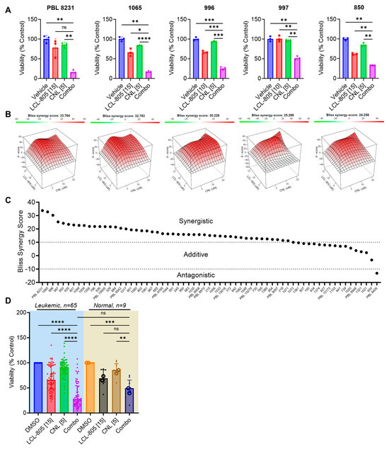LCL-805 increased pro-death ceramides and the C16-/C24:1- and C16-/C24-ceramide ratios, which prompted us to evaluate the cytotoxic effects of combining exogenous ceramide with LCL-805. To this end, we tested LCL-805 and CNL across a panel of primary AML patient samples. The effect of LCL-805, CNL, or the combination on cell viability and the corresponding Bliss synergy scores from the top five patient samples most sensitive to the combination are shown in Figure 9A,B. LCL-805 and CNL demonstrated modest efficacy as single agents. However, the combination resulted in highly potent synergistic lethality (Figure 9A,B). Treatment of AML patient samples with the CNL and LCL-805 combination demonstrated synergistic (n = 48) or additive (n = 16) Bliss synergy scores, while only one exhibited antagonism (Figure 9C). We also compared these results in primary AML patient samples to nine healthy donor normal samples (seven PBMC and two whole bone marrow samples). As single agents, LCL-805 and CNL demonstrated similar loss of viability in primary AML patient samples and normal controls. The combination of LCL-805 and CNL reduced cell viability more in leukemic AML patient samples compared to healthy donor samples although the differences were not statistically significant (Figure 9D). Cell viability dropped to less than 50% in only 52.9% of patient samples treated with single-agent LCL-805 up to 20 µM (Figure 3C). However, the addition of CNL (5 µM) with 15 µM LCL-805 resulted in a loss of cell viability greater than 50% in 70.8% of patient samples (Figure 9D). Together, these results demonstrate the promising therapeutic effects of combining AC inhibition with exogenous ceramide supplementation.
