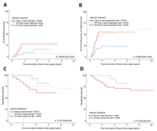 Incidence and survival curves following CLD. (A) The cumulative incidence of LNB relapse of each adjuvant treatment group. (B) The cumulative incidence of any progression or relapse of each adjuvant treatment group. (C) Overall survival of each adjuvant treatment group. (D) Overall survival of patients receiving ST compared to those not receiving any ST. (A,B) Assessed using competing event models. (C,D) Assessed using Kaplan–Meier and log-rank tests. All figures exclude patients with disease recurrence or progression within 90 days of CLD.