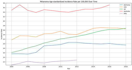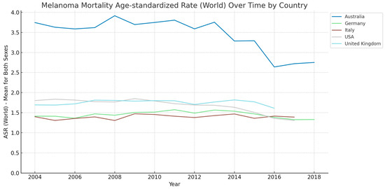 Figure 2 shows the age-standardized mortality rates obtained from the International Agency for Research on Cancer (Cancer Over Time dataset). The age-standardized rates were adjusted to the world standard population. The ASR for melanoma in Germany showed a general increase in the earlier years, peaking around 2011, followed by a slight decrease toward 2018. The peak ASR was observed in the early 2010s, indicating an upward trend in melanoma mortality rates during this period, which subsequently began to decline. In Australia, there was a notable decrease in the ASR over the study period. The rates started higher compared to other countries but showed a significant downward trend, especially after 2008, reflecting effective melanoma management and prevention strategies. The ASR in Italy exhibited fluctuations throughout the period. There were periods of increase, notably, around 2014 and 2016, but the overall trend shows a slight decrease toward the end of the study period, especially after 2016. The UK’s ASR showed a gradual increasing trend until around 2014, followed by a slight decrease. The rates remained relatively stable compared to other countries, with modest fluctuations over the years. The USA displayed a consistent decrease in the ASR from 2004 to 2018. The rates were initially on the higher side but showed a steady decline, indicating improvements in melanoma treatment and prevention. Across all countries, there was a noticeable variation in the ASR, with some countries like Australia showing a significant decrease, while others like the UK and Italy exhibited more stable trends with slight fluctuations. Overall, although the incidence rates increase across the countries, the mortality rates seem to be stable or reveal a decreasing pattern. These findings might reflect the effectiveness of public health policies, healthcare systems, and awareness campaigns resulting in more diagnoses of early-stage melanoma as well as better treatment options and algorithms.