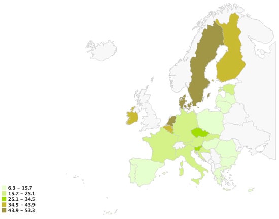 Age-standardized incidence rate per 100,000 in 2022 in EU-27. Melanoma of skin; both sexes, all ages [14].