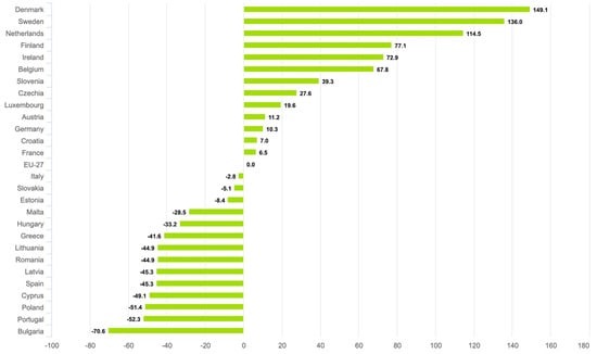 The distribution of age-standardized melanoma incidence rates among the EU-27 for 2022, the latest data from the European Cancer Information System, is depicted in Figure 3. The highest rates are observed in northern countries, including Denmark (149.1), Sweden (136.0), the Netherlands (114.5), Finland (77.1), Ireland (72.9), and Belgium (67.8). Figure 4 presents the relative change (%) in age-standardized incidence rates compared to the EU-27 average, further substantiating the findings mentioned above.