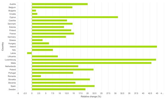 The long-term projections of cancer incidence rate changes for the EU-27 countries, comparing 2040 with 2022, are illustrated in Figure 5. These estimates indicate an increase in melanoma cases within the EU-27, rising from 101,510 in 2022 to 115,540 in 2040. This represents a relative increase of 13.83%. Ireland is expected to see the most significant relative increase (45%), followed closely by Luxembourg (44.7%), Malta (43%), and Cyprus (31%). Latvia stands out as the only country where a decrease in melanoma rates is projected, at −1.7%.