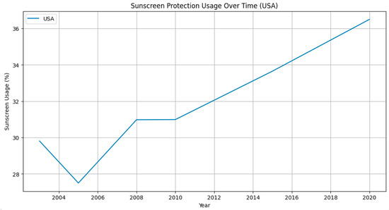 Rise in sunscreen usage in the USA from 2004 to 2020. Note: Percentage of adults aged 18 years and older (USA) who always or most of the time protect themselves from the sun by using sunscreen with a sun protection factor of 15 or higher [22].