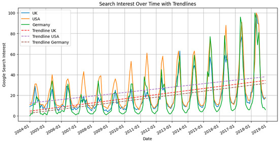 Comparative analysis of Google search interest related to sun-protection usage from January 2004 to December 2018 in the USA, the UK, and Germany. Data were sourced from Google Trends using the search terms ‘sunscreen’ for the USA and UK and ‘sonnencreme’ for Germany. Solid lines indicate actual search interest over time, while dashed lines depict trendlines for each respective region. The values represent search interest relative to the highest point on the chart for the given region and time period. A value of 100 denotes peak popularity for the term; 50 indicates that the term is half as popular, and 0 means insufficient data for the term. It is evident that search terms were used more frequently during summer months and have been increasingly searched over time, indicating a growing interest in sun-protection usage [23].
