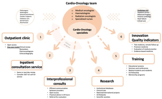 Cardio-Oncology is a broad and complex area of knowledge which requires a multidisciplinary approach. To be successful, a comprehensive Cardio-Oncology program should comprise different sections. The clinical part takes place mainly in the outpatient clinic, but should also cover inpatient and interprofessional consultations. Easy and fast accessibility and multidisciplinary meetings are essential for the promotion of shared decision-making. As lack of evidence is frequent in some fields, creation of institutional databases, engaging in national and international societies and promoting participation in clinical trials and multicentric studies constitute important steps within the research section. An appropriate training is achieved through educational sessions, fellowship and mentorship programs. Lastly, Cardio-Oncology activity and results should be measured by thorough quality indicators.