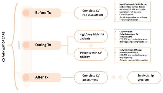 Cardio-Oncology clinical care pathway. Figure shows the management of cancer patients before, during and after cancer therapy. Abbreviations: CO, Cardio-Oncology; CV, cardiovascular; ECG, electrocardiogram; NP, natriuretic peptides; TTE, transthoracic echocardiography; Tx, treatment.