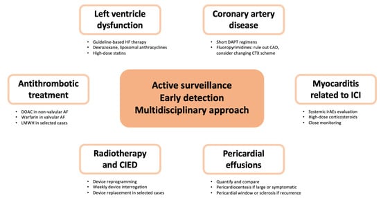 Disease-specific clinical pathways. Figure shows the main measures to take into account when a specific cancer-related cardiovascular complication appears. Abbreviations: AF, atrial fibrillation; CAD, coronary artery disease; CIED, cardiac implantable electronic devices; CTX, chemotherapy; DAPT, dual antiplatelet treatment; DOAC, direct oral anticoagulants; ICI, immune checkpoint inhibitors; irAEs, immune-related adverse events; LMWH, low-molecular-weight heparin.