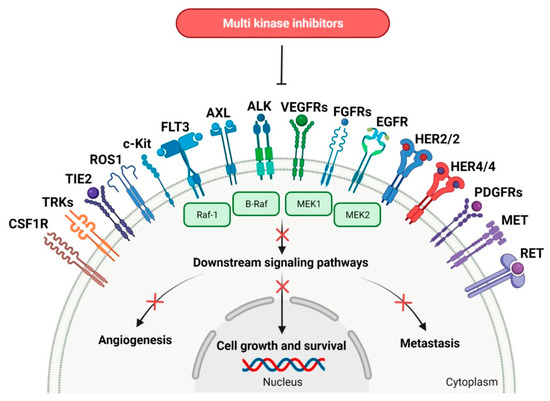 The schematic figure illustrates the sequence of events that occur upon RTK activation (the “x” on the arrows indicates process inhibition): 1. Ligand binding: the specific ligand binds to the extracellular domain of the RTK; 2. Dimerization: the binding of the ligand induces the RTK to dimerize, bringing the intracellular domains of the two RTKs into close proximity; 3. Cross-phosphorylation: tyrosine residues within the intracellular domains of the RTKs are phosphorylated by each other; 4. Activation of downstream signaling pathways: the phosphorylated tyrosine residues serve as docking sites for various signaling proteins, initiating a cascade of downstream signaling pathways; 5. Cellular response: the activation of downstream signaling pathways ultimately leads to cellular responses such as cell proliferation, differentiation, survival and motility. Notes: CSF1R: colony-stimulating factor 1 receptor. TRKs: tropomyosin receptor tyrosine kinases. TIE2: tunica interna endothelial cell kinase 2. ROS1: proto-oncogene tyrosine-protein kinase ROS. c-Kit: mast/stem cell growth factor receptor. FLT3: FMS-like tyrosine kinase-3. AXL: AXL receptor tyrosine kinase. ALK: anaplastic lymphoma kinase. VEGFRs: vascular endothelial growth factor receptors. FGFRs: fibroblast growth factor receptors. EGFR: epidermal growth factor receptor. HER2/2: human epidermal growth factor receptor 2 and 2. HER4/4: human epidermal growth factor receptor 4 and 4. PDGFRs: platelet-derived growth factor receptors. RET: receptor tyrosine kinase rearranged during transfection. B-Raf: serine/threonine-protein kinase B-Raf. Raf-1: RAF serine/threonine-protein kinase. MEK1: mitogen-activated protein kinase 1. MEK2: mitogen-activated protein kinase 2. MET: mesenchymal-epithelial transition factor. Created with BioRender.com and published on https://encyclopedia.pub/entry/22089#ref_67 (last access: 26 November 2023) as adaptation from Sochacka-Ćwikła A et al. [8] under a Creative Commons Attribution 4.0 International License http://creativecommons.org/licenses/by/4.0/ (last access: 26 November 2023).