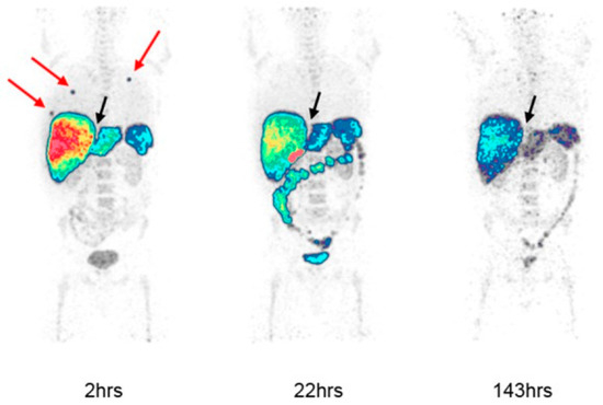 Maximum intensity projection (MIP) images of [89Zr]Zr-panitumumab PET acquired at 2, 22 and 143 h in a patient with metastatic colorectal cancer. The focal tracer accumulations (red arrows) in the lungs are noted at 2 h imaging and resolved completely on subsequent scans. Meanwhile, the liver metastases appeared photopenic (black arrow). Note the high physiologic accumulation of the tracer in the liver, spleen, bowels and bladder. Reproduced from Lindenberg L, et al. [31] under “Creative Commons Attribution Noncommercial License” (last access: 26 November 2023).
