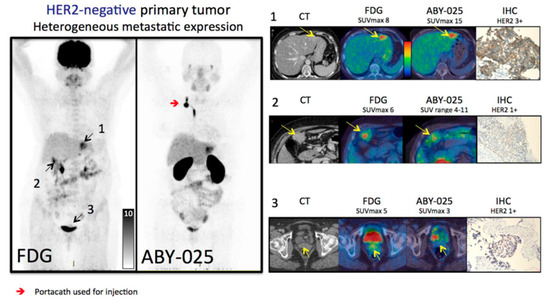 Multipanel image comparing [68Ga]Ga-ABY-025 PET/CT and 2-[18F]FDG (2-Deoxy-2-[18F]fluoroglucose) PET/CT in a metastatic breast cancer patient with an HER2-negative primary tumor. 2-[18F]FDG-PET/CT showed metastases in left liver lobe, peritoneal lymph nodes and cervix of uterus, while ABY-025 uptake was high in the liver lesion, low in peritoneal metastases and absent in the cervix. At IHC, the liver lesions confirmed true metastases, whereas the other sites were true negative. Modified from Sörensen J et al. [50] published under a Creative Commons Attribution (CC BY-NC) License https://creativecommons.org/licenses/by-nc/4.0/ (last access: 26 November 2023).