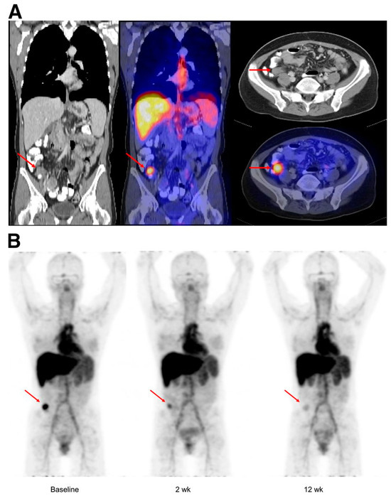 [89Zr]Zr-bevacizumab PET images in patient with metastatic midgut carcinoid obtained 4 days post-injection. Upper panel (A) includes low-dose CT and fusion PET/CT images at the level of the abdominal tumor lesion (red arrows). Lower panel (B) illustrates MIP images obtained at baseline, 2 weeks and 12 weeks after everolimus treatment, proving a progressive decrease on the tumor uptake (red arrows). Note the physiologic [89Zr]Zr-bevacizumab uptake in the heart, liver, spleen and blood pool. Reproduced from van Asselt SJ et al. [75] for non-commercial use.