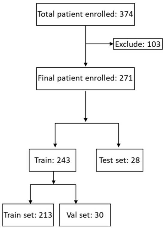 Flowchart of study enrollment. We initially enrolled 374 patients. One hundred and three cases were excluded due to poor resolution of images. Finally, images from 271 patients were included, with 243 in the train set and 28 in the test set.
