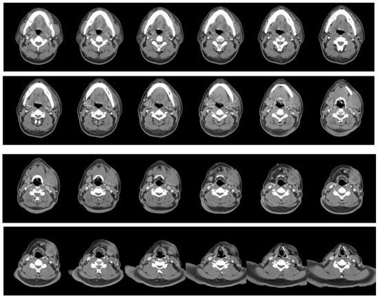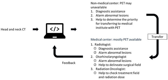 Medical imaging plays a crucial role in the clinical workup, with various tools available, including computer tomography (CT), magnetic resonance imaging (MRI), and positron emission tomography (PET) [5,7]. Each imaging tool offers unique advantages. For example, CT effectively finds bony invasion, while MRI excels at delineating soft tissue involvement. In contrast, PET can provide a comprehensive diagnosis of locoregional and distant metastasis by measuring cell activity using F-18 [8]. The efficacy of using medical images as clinical diagnostic tools has been evaluated [4,9]. Some features of lymph nodes related to morphology or enhancement on images may indicate tumor involvement: a shorter axis of a lymph node of >1 cm, heterogeneous enhancement, or rough border of a lymph node, which might be a sign of ENE [10]. However, even when interpreted by well-experienced clinical physicians or radiologists, the sensitivity and specificity of CT images were 72% and 83%, respectively, while the area under the receiver operating characteristic curve (AUC) was 0.65–0.69 [11,12]. In contrast, the sensitivity and specificity with MRI were 0.7–0.8 and 0.5–0.7, respectively [13,14].