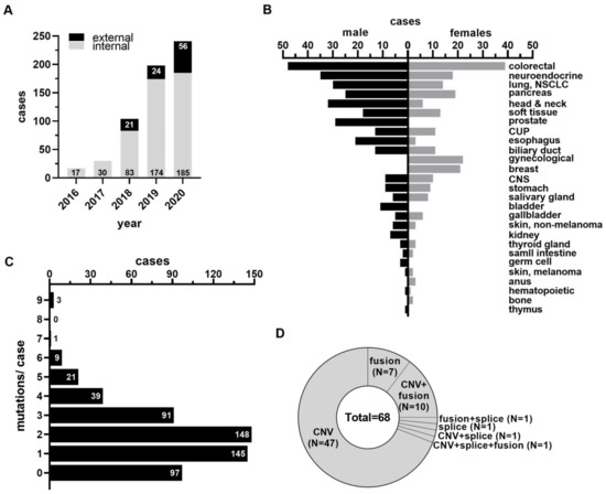 - Zehir, A.; Benayed, R.; Shah, R.H.; Syed, A.; Middha, S.; Kim, H.R.; Srinivasan, P.; Gao, J.; Chakravarty, D.; Devlin, S.M.; et al. Mutational landscape of metastatic cancer revealed from prospective clinical sequencing of 10,000 patients. Nat. Med. 2017, 23, 703–713. [Google Scholar] [CrossRef] [PubMed]