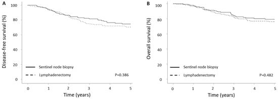 Regarding survival outcome, survival curves suggested that DFS was similar in the two groups (Figure 2A, p = 0.386). The estimated 5-year DFS rate was 76.7% and 72.2% for patients in the SLNB and LND groups, respectively. During the follow-up, 33 (22.0%) and 48 (25.7%) deaths were recorded in the SLNB and LND groups, respectively. The 5-year OS rates were 80.7% and 77.0% in the SLNB and LND group, respectively (Figure 2B, p = 0.482).